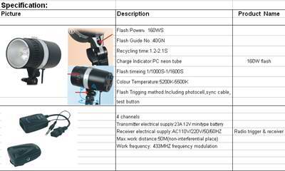 3)      2pcs of soft boxes 20”*28”(50cm*70cm); match up 160w flash